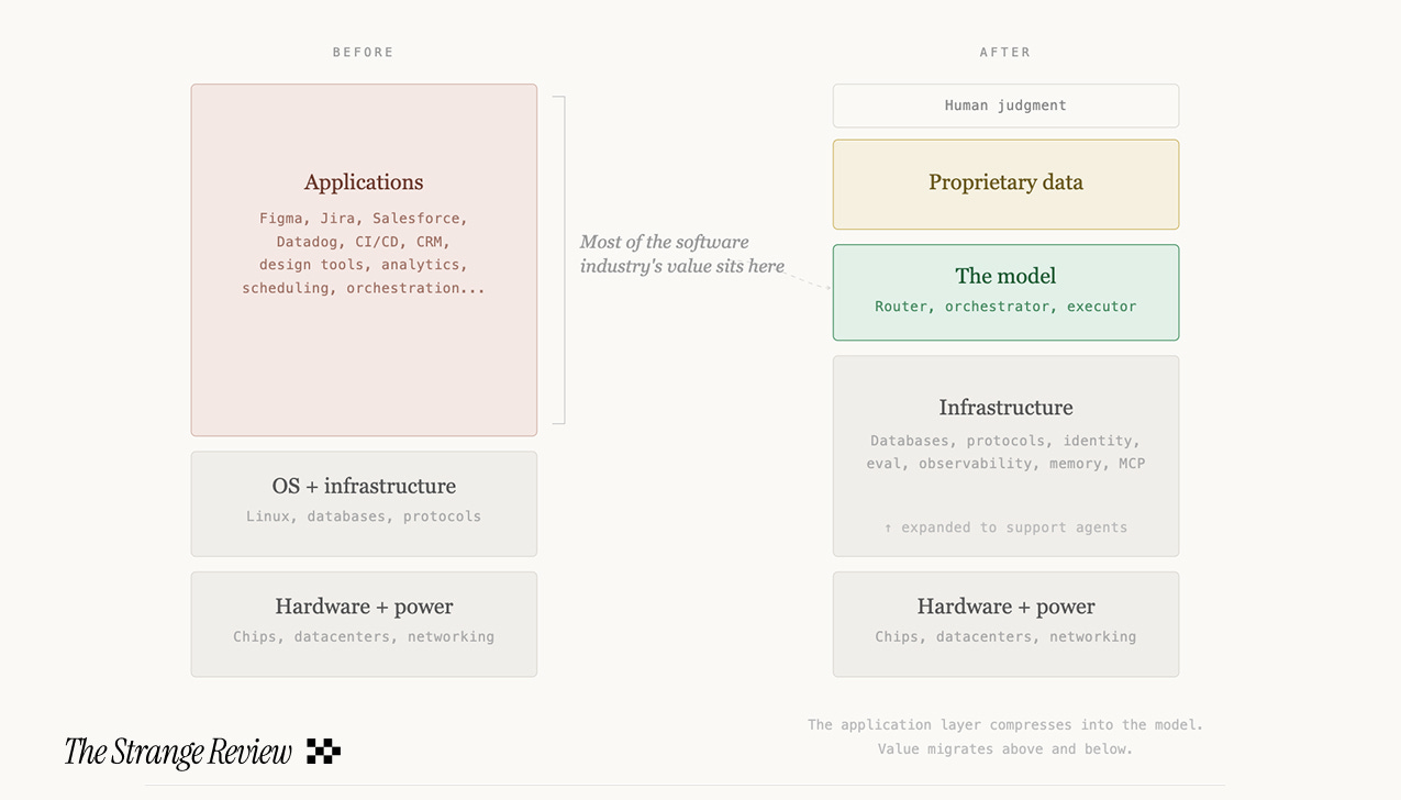 For forty years, the computing stack has had a stable shape: hardware at the bottom, operating systems and infrastructure in the middle, applications on top. The application layer is where most of the software industry’s value has sat. Each application is a product, sold by a company, with its own sales cycle, implementation, and license.