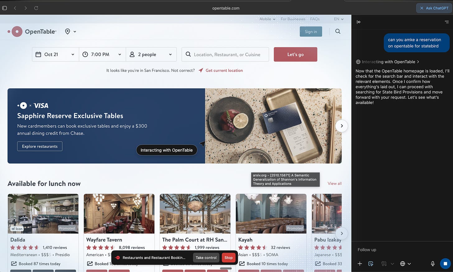 I tried booking a restaurant through OpenTable with Agent Mode, and it got me to the sign-in page. Was it painfully slower than me manually navigating to it and checking out myself? Yes, for now. But in the future, it could just happen in the background.