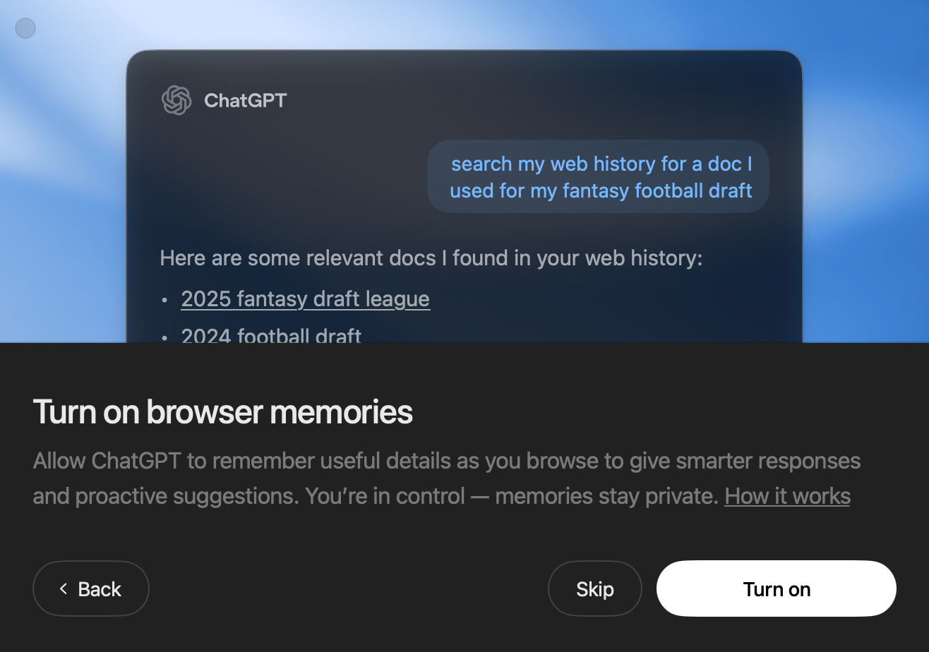 From OpenAI’s head of product, Fidji Simo: “If you turn on browser memories, ChatGPT can remember the pages you visit and use that context in helpful ways.