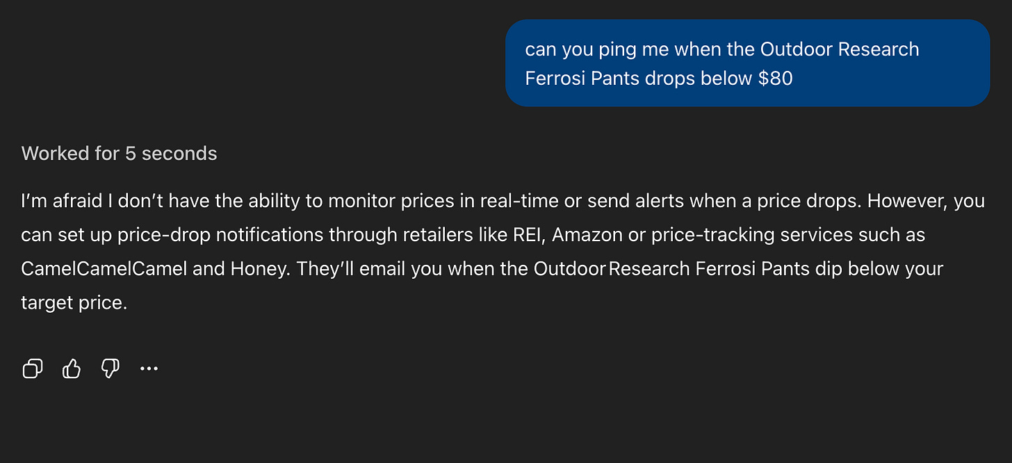 But it’s not perfect yet. I asked it to set me up a price alert for when a pair of pants went below $80, and it couldn’t do it.