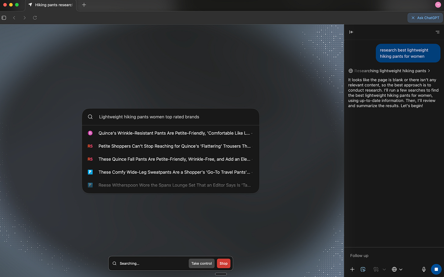 Agent Mode lets you delegate tasks directly. I asked it to find “best lightweight hiking pants” and it crawled through reviews to surface synthesized recommendations. Not search results. Recommendations.