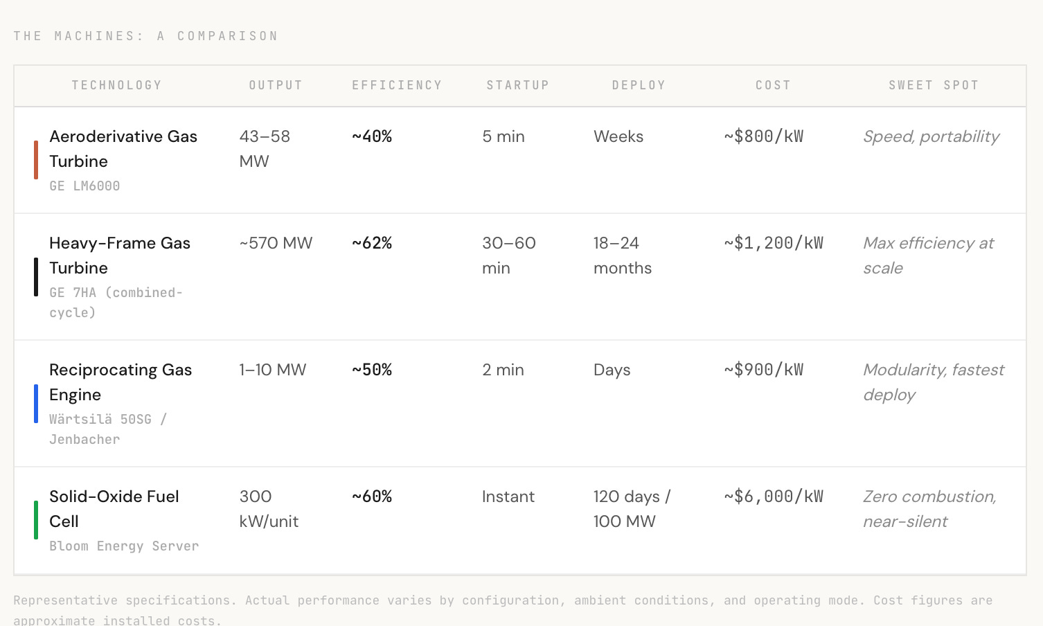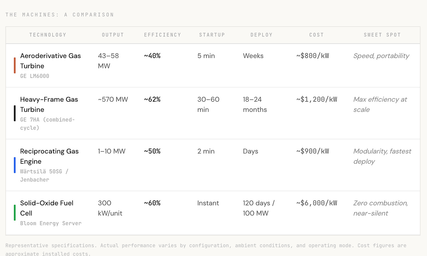 Install gas turbines or engines directly on-site. The brute force approach. Fast, capital-intensive, and increasingly systematized.