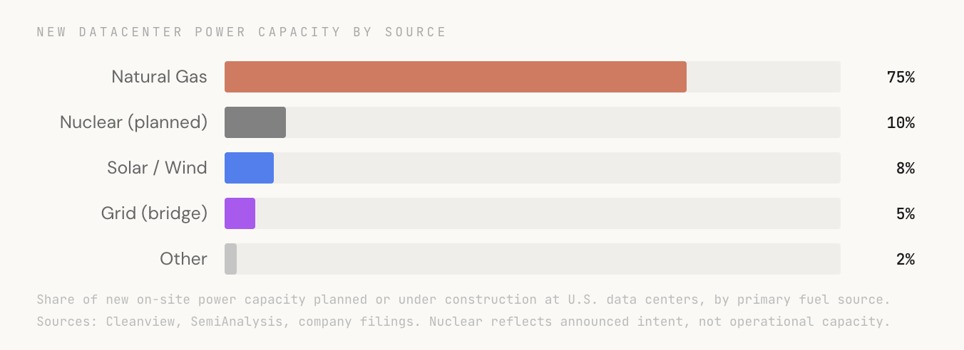 Nearly 75% of new power capacity being built for data centers runs on natural gas. The reason is simple: it’s abundant, it’s dispatchable, and critically, it can be deployed now.