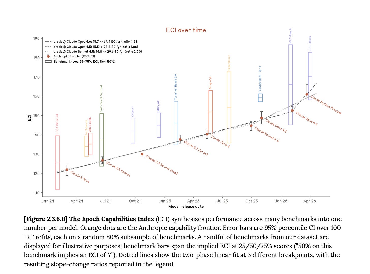 Anthropic introduces a new aggregate metric in this system card, the Epoch Capabilities Index, which synthesizes hundreds of benchmarks into a single score. The capability trajectory bent upward with this model, Mythos.