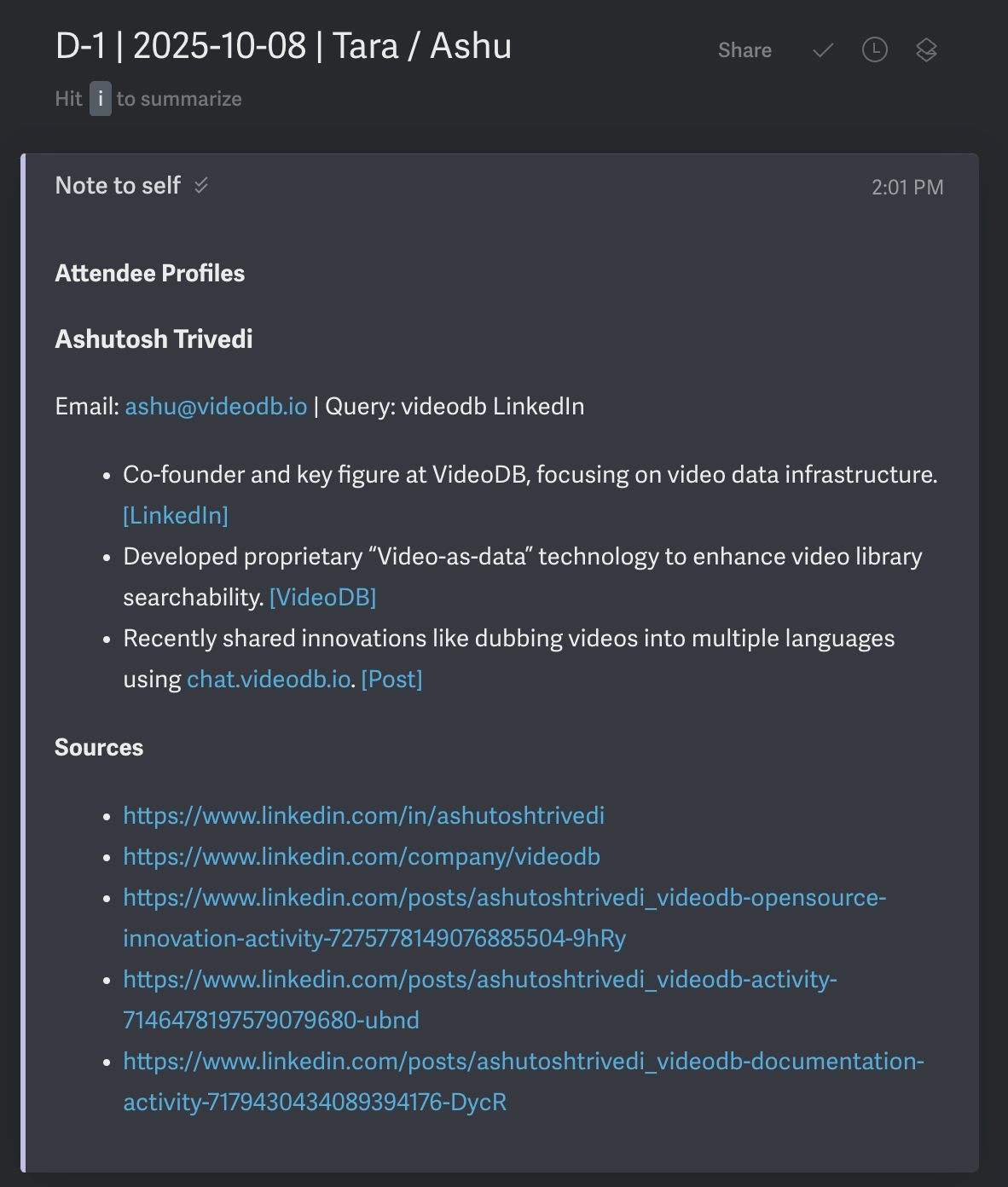 To test these out, I spun up a meeting brief agent using Agents SDK via Codex CLI (also did a successful test drive with Claude Code) that connected to my Google Calendar, scanned attendee bios, and sent me a one-page briefing before every call.